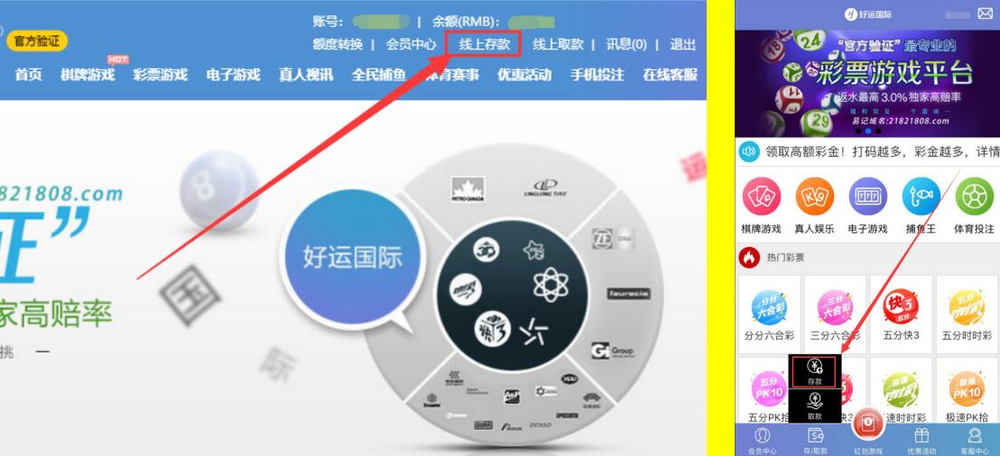 手机用户:登入您的会员账号, 点击【存/取款--存款】