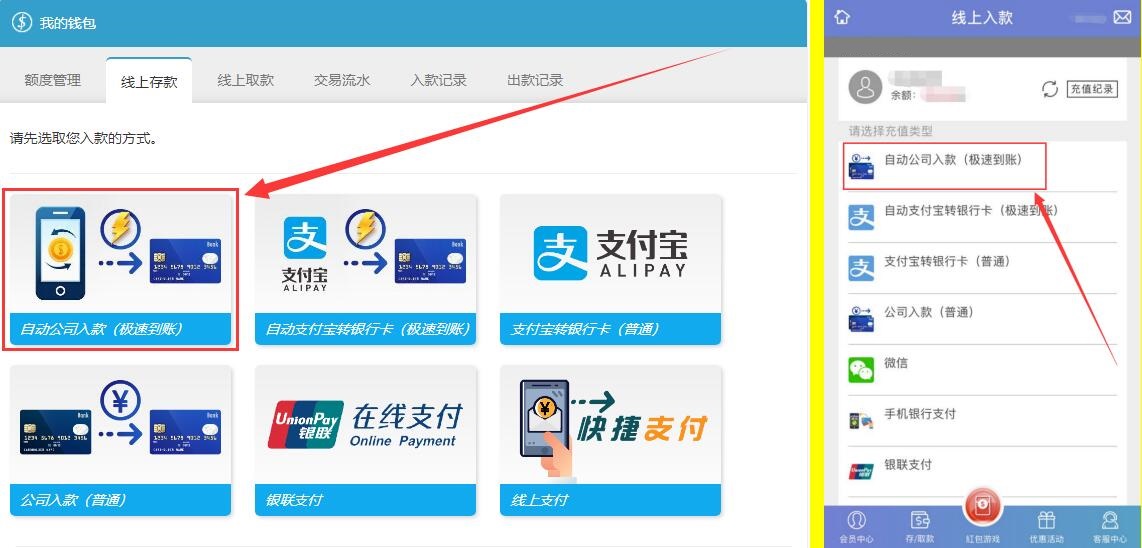 电脑/手机用户:进入线上存款页面,点击自动公司入款(极速到账)。