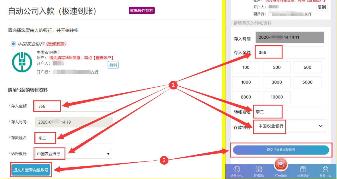 电脑/手机用户:选择要【转入银行】(即您即将要转入的我司收款银行)→填写【存入金额】(请存入有尾数金额,方便系统辨别.如:235、876 个位数有尾数的金额,最低存款1元)→填写【存款姓名】(即会员扣款银行卡户主姓名)→选择【转账银行】(即您要扣款的银行名称)→点击【提交并查看完整账号】